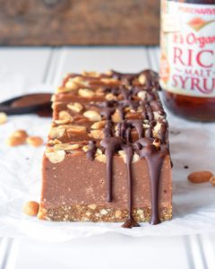 InstructionsIn a food processor, process the peanuts into small pieces. Add the medjool dates and rice malt syrup and process again until it form a dough. Press into a lined baking tray of desired size. You could also make this as a round cake, or even individual bites in a mini cupcake tray. To make the the filling add all of the ingredients to a large bowl. Keep mixing until it all comes together. Spread evenly over the base. Top with a handful of peanuts, press them in slightly them place the slice in the freezer to firm up enough to slice neatly. A couple of hours should do it. Melt the chocolate and drizzle as desired. I like to keep this slice in the freezer, and then leave it to soften at room temp for 5 minutes or so.